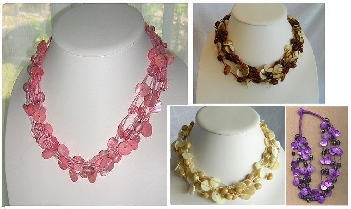 | Amber and Mauve Coloured glass necklace | Shell beaded necklace in four colours |